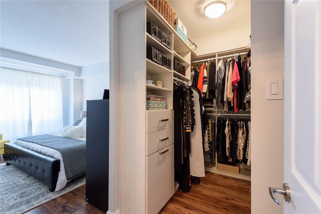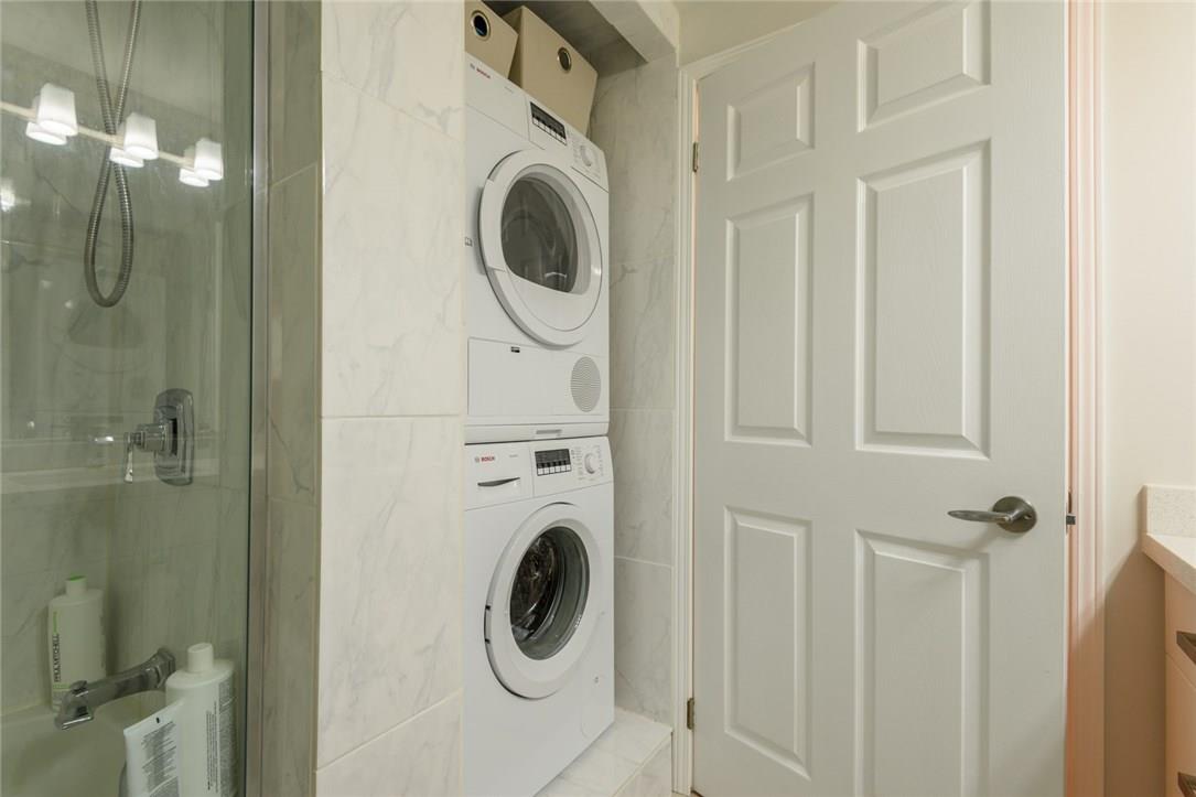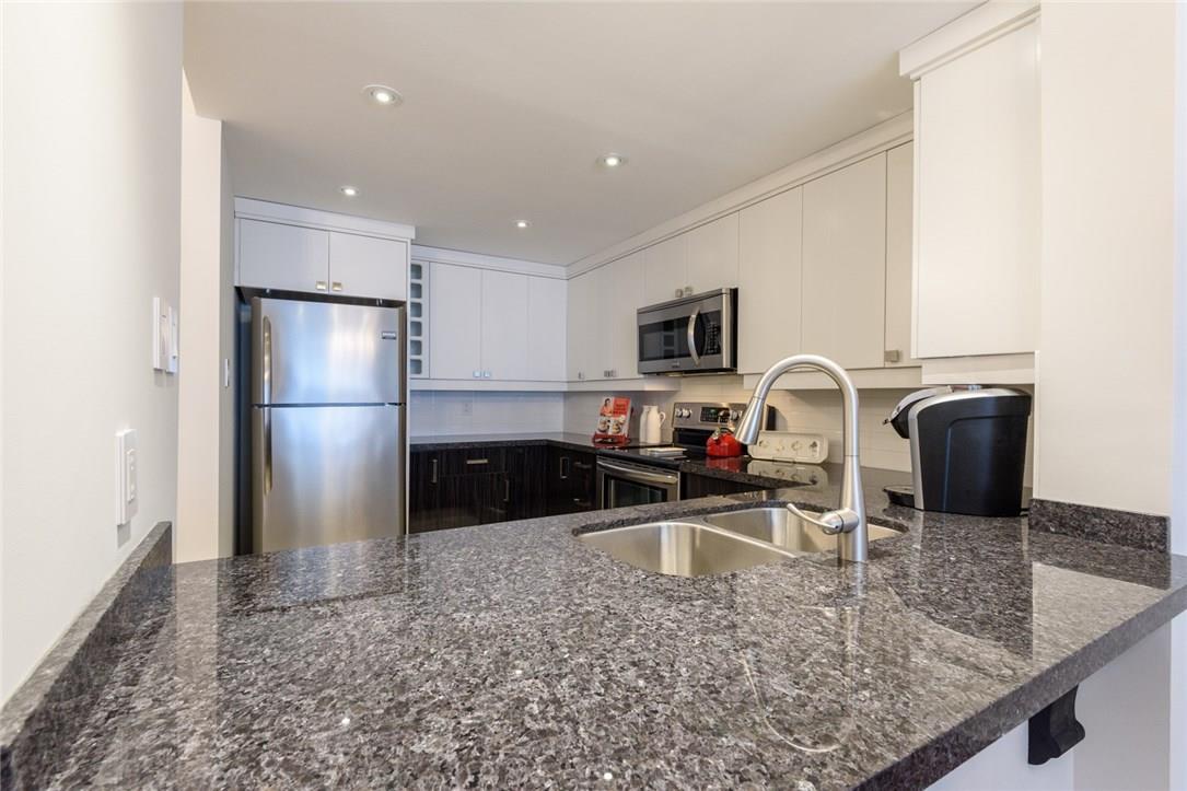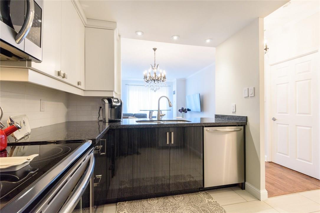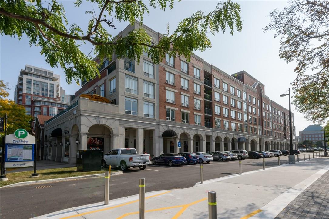 EXQUISITE SUITE & SUPERIOR LOCATION!! Welcome to this fully renovated 1 bedroom suite. Located on the top floor of an upscale boutique building in the heart of downtown Burlington. Southern exposure offers views of the Lake & Village Square. Everything is at your doorstep Just a short stroll to the Pier, Spencer Smith Park, Restaurants, Shops, Gym, & Transit. Fully remodelled open concept kitchen features granite counters, pot lights, under-valance lighting, white tile backsplash, built-in wine rack & premium s/s appliances. Bright & beautiful 4 Pc bathroom with granite counters, custom mirror & glass shower enclosure. Spacious master with custom designed walk-in California Closet. Designer light fixtures throughout the suite. Ensuite Bosch washer & dryer. Custom black out shades. 1 underground parking spot (Level 1, #14). Low condo fee includes hydro, CAC, heat, water & parking! Roof top patio access located just down the hall. Recently painted in neutral designer decor. All you need to do is unpack! (Pls note: no pets allowed as per condo rules) (id:17834)