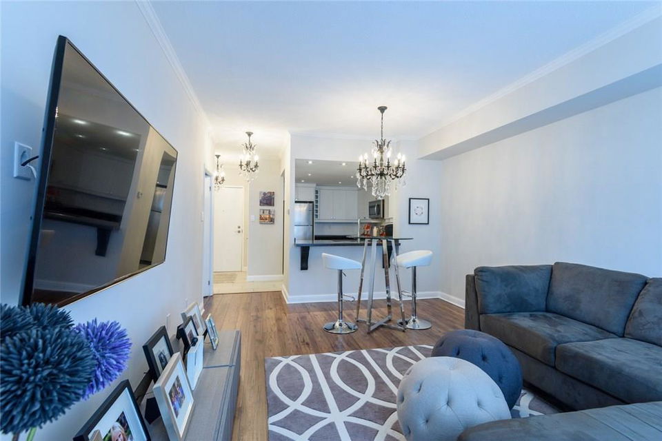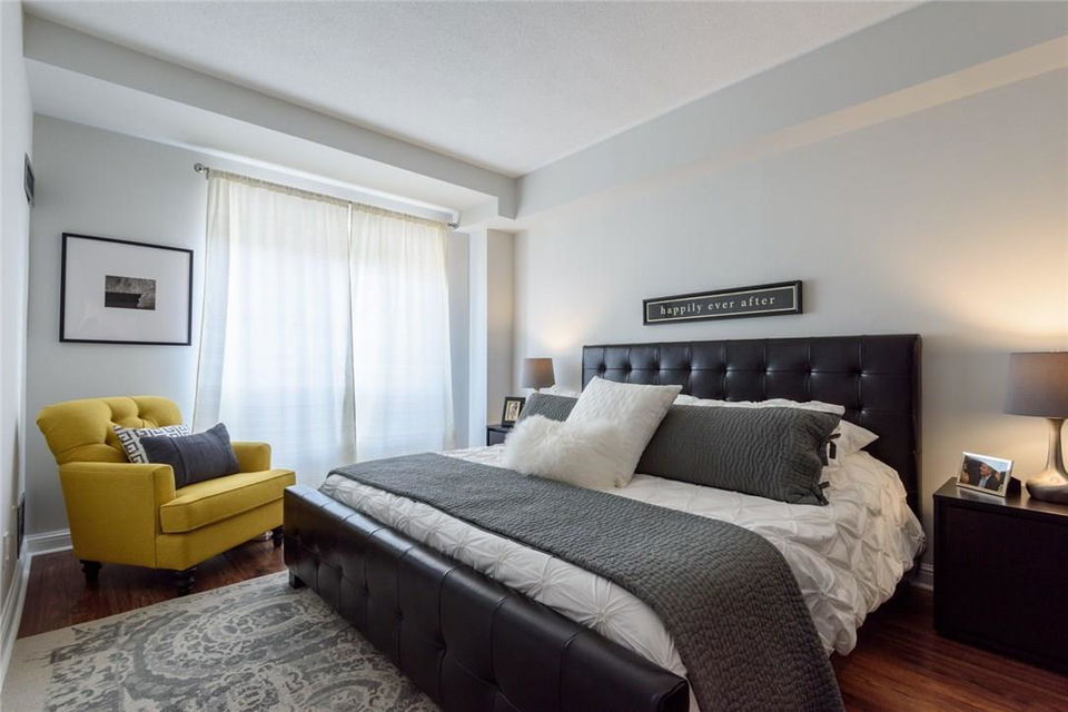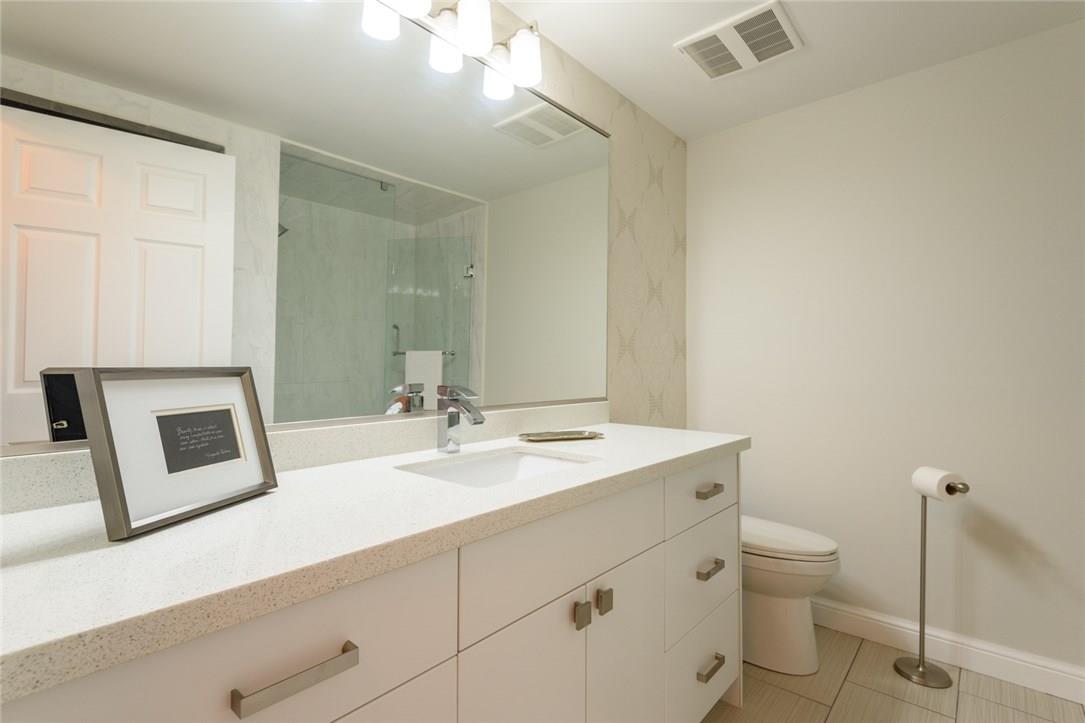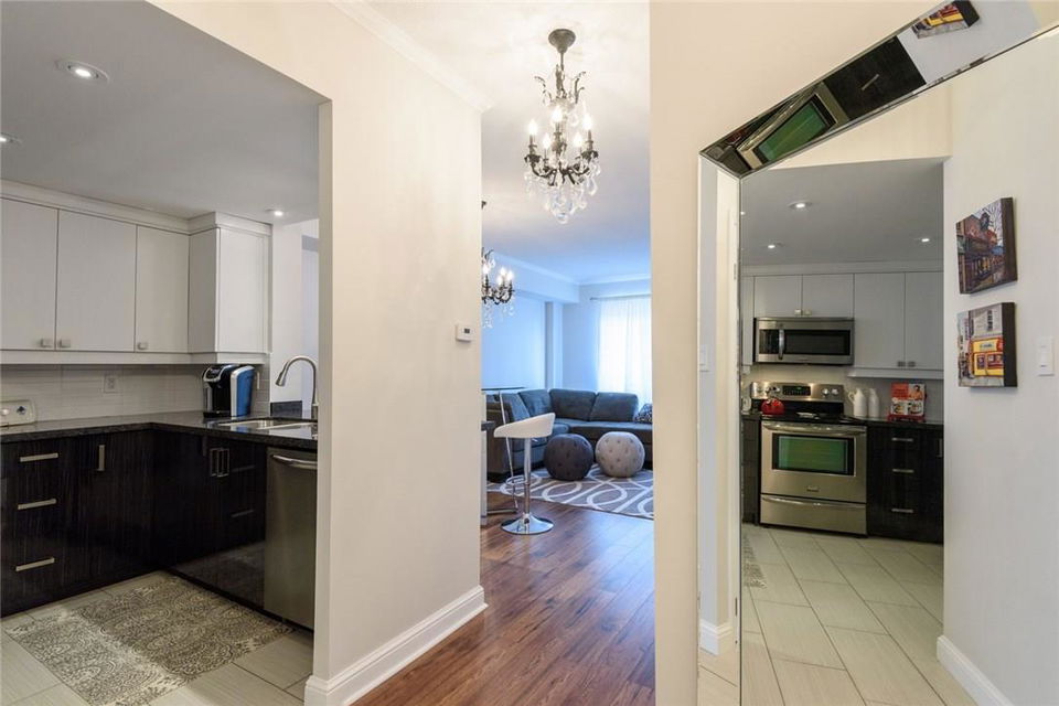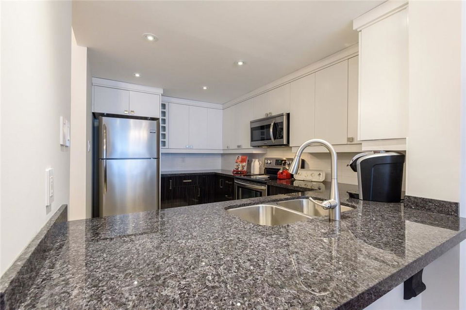 EXQUISITE SUITE & SUPERIOR LOCATION!! Welcome to this fully renovated 1 bedroom suite. Located on the top floor of an upscale boutique building in the heart of downtown Burlington. Southern exposure offers views of the Lake & Village Square. Everything is at your doorstep Just a short stroll to the Pier, Spencer Smith Park, Restaurants, Shops, Gym, & Transit. Fully remodelled open concept kitchen features granite counters, pot lights, under-valance lighting, white tile backsplash, built-in wine rack & premium s/s appliances. Bright & beautiful 4 Pc bathroom with granite counters, custom mirror & glass shower enclosure. Spacious master with custom designed walk-in California Closet. Designer light fixtures throughout the suite. Ensuite Bosch washer & dryer. Custom black out shades. 1 underground parking spot (Level 1, #14). Low condo fee includes hydro, CAC, heat, water & parking! Roof top patio access located just down the hall. Recently painted in neutral designer decor. All you need to do is unpack! (Pls note: no pets allowed as per condo rules) (id:17834)